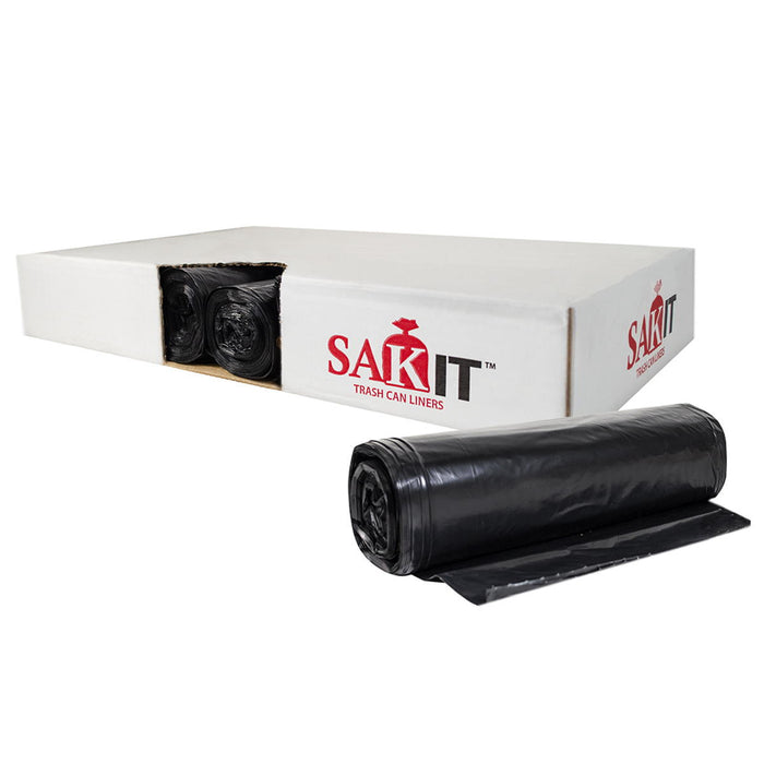 These 60 gallon black trash can liners from Sak-It are made from up to 70% recycled resin. These environmentally responsible bags are heavy duty and ideal for most trash applications. Bag size is 38" x 58" with a 1.0 mil thickness. The linear low-density polymer makes these garbage bags more tear-resistant and flexible. The star seal bottom helps prevent leaking.