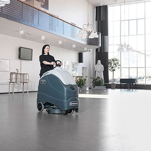 The Advance SC1500 is a unique riding scrubber that requires you to stand to operate. The SC1500 is designed to deliver superior cleaning performance by providing flexibly, extreme maneuverability and compact solutions for small to medium-sized areas. This standing model allows for the unit to be controlled effortlessly, while keeping a small foot print when compared to other bulky ride on floor scrubbers. For simple operation, all the scrubbing parameters like brush pressure, detergent flow, pressure, solution flow and vacuum are controlled by a single button and are clearly displayed on the easy-to-read, LCD graphical display.