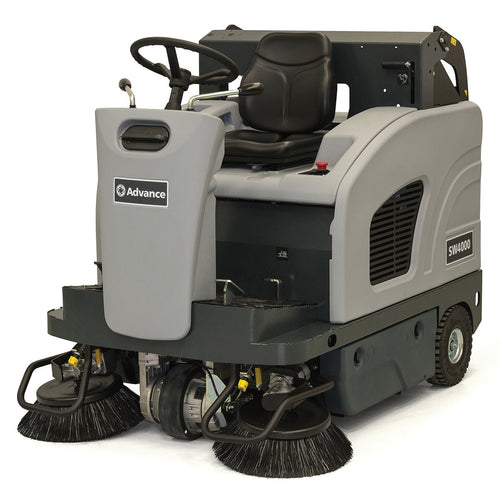This 49" Advance SW4000 rider sweeper has a 49 inch sweep path with the ability to cover up to 94,200 ft²/hour. The operator intuitive front wheel steering and front wheel drive allow superior maneuverability in tight corners and narrow aisles. For use in diverse indoor and outdoor applications, this rider sweeper maximizes cleaning performance while reducing the total cost to clean.