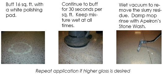 Most effective when used following the scratch removal process. Because of an initial chemical reaction with the stone, it's important to cover the designated 16-20 sq. ft. area quickly at first. Buff the area consistently, with a slow side-to-side motion. If the area begins to dry, simply add just enough water to keep the area wet. When finished, flood the area and make two passes with machine to break up any dried residue and wet-vacuum the slurry.