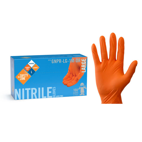 These Safety Zone orange nitrile gloves are food grade gloves that work great in food service and food processing environments. They are 100% free from latex, powder-free, and are a great compromise between latex and vinyl. They are allergy safe, and feel like latex but are stronger. A great option for both cleaning and dishwashing. Nitrile is very resistant to chemicals and punctures. The 4 mil thickness and 9.6" length from fingertip to cuff provide enhanced durability during use.