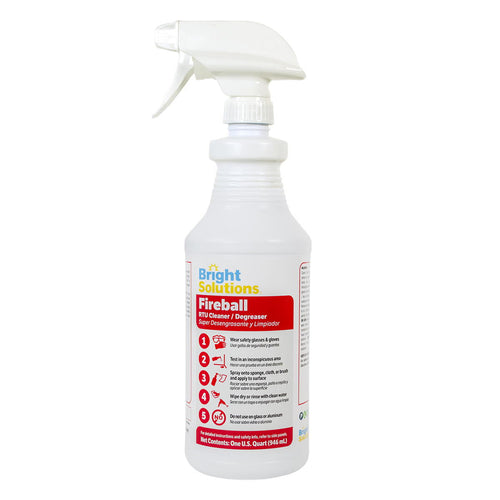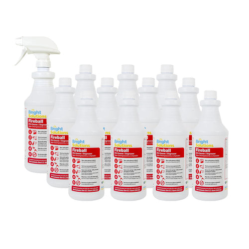 Bright Solutions Fireball is a super strength multi-purpose cleaner degreaser that removes grease, dirt, mildew stains, soap scum, wax, and other soils from most water washable surfaces. It can be used on kitchen and bathroom surfaces including tile, stoves, hoods, ovens, filters, fiberglass, tubs, showers, porcelain, and chrome.