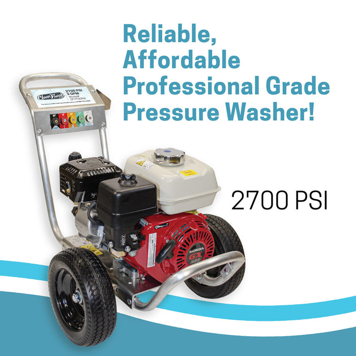 When the big-box-store pressure washers won’t hold up during those tough cleaning jobs, you can turn to this reliable yet affordable professional grade pressure washer from CleanFreak! This heavy-duty pressure washer is powered by a Honda GX200 gas engine, which is perfect for most commercial and residential applications. It delivers 3 gallons of water per minute, at 2700 PSI. A great mix of volume and pressure to work efficiently on larger jobs.