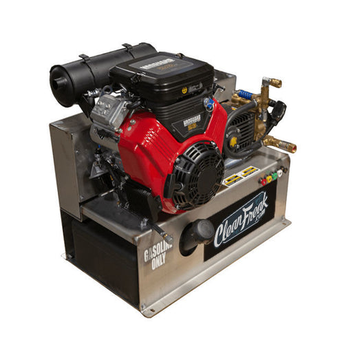 This CleanFreak stationary pressure washer is powered by a 23 HP Vanguard gas engine from Briggs & Stratton. It is powered by a 8.0 GPM @ 3,000 PSI industrial strength Triplex pump. The setup includes a 12 Volt ignition system, spray gun, wire braided discharge hose, and stainless steel tips.