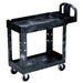 This heavy duty Rubbermaid® service and utility cart is perfect for transporting materials, supplies, and heavy loads in almost any environment. Offers great stability, yet is lightweight and offers easy maneuverability. Ergonomically designed push handle provides optimum hand placement and push height improving control and worker safety. Molded-in storage compartments, holsters, hooks, and notches offer great efficiency.