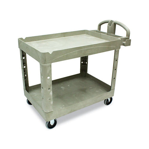 This Rubbermaid Commercial heavy duty 2-shelf service & utility cart is so versatile and durable that it can easily transport up to 500 lbs. It comes with molded-in compartments, holsters, hooks, notches, and customizable fittings for more storage options. An ergonomic push handle provides optimum hand placement for better control.