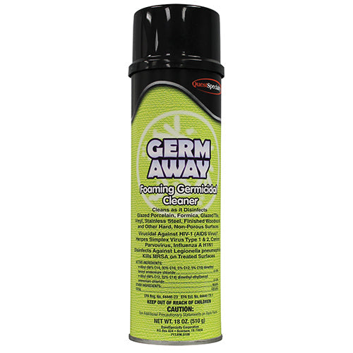 Hospeco® Germ Away is an EPA registered germicidal cleaner and disinfectant. This foaming solution is a water-based aerosol that combines butyl, surfactants, and emulsifiers with a quaternary germicide to allow you to deep clean surfaces all the while disinfecting the surface as well. This product is safe for use on all bathroom surfaces and will not harm chrome or metal surfaces. The disinfectant kills a wide range of organisms in 10 minutes like MRSA, Influenza A Virus, HIV-1 (AIDS), Salmonella, Staphylococcus, Herpes, and more. It also kills viruses similar to SARS-CoV-2 (which causes COVID-19) and can be used against SARS-CoV-2 when used as directed.