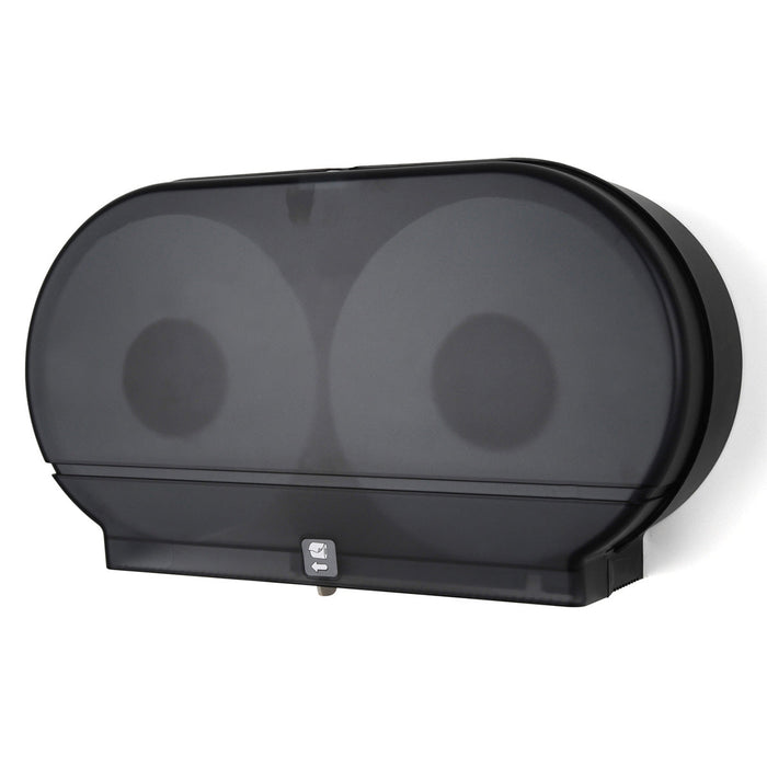 This twin jumbo roll toilet paper dispenser holds two rolls of our 2 ply jumbo roll toilet paper. It will accommodate any style of 9" or smaller roll, as long as it has 3⅜" or 3½" core. The sliding panel ensures that each roll is used up before starting on the 2nd roll. With this dispenser you'll ensure that your restroom users will never be left in a tough situation again. A lockable case prevents theft. The translucent cover allows the janitor, or stock person, to see when a roll is finished and needs to be replaced.