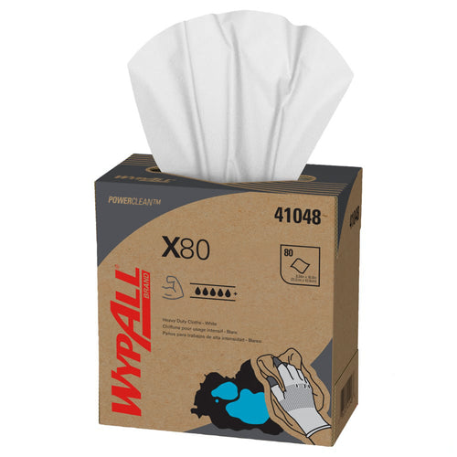 These Kimberly-Clark Wypall X80 white towels are extended use, disposable wipers that are work great for cleaning up grease or soaking up spills thanks to the patented HYDROKNIT® fast-absorbing material. The soft pulp fibers are bonded to a polypropylene base sheet to allow for ultimate absorbency and durability. This towel is a great option for removing oil, dirt, grime, and solvents in industrial and manufacturing settings and can be used either wet or dry. The material is durable and holds up to us in a range of applications including wiping down heavy-duty machines, cleaning up metal shavings, prepping surfaces with solvents and cleaning rough surfaces. This x80 towel also comes in a box dispenser which allows for quick availability for when a fresh wiper is needed.