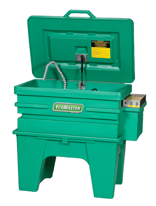 This heated automotive parts washer will accommodate our biodegradable water-based degreaser to 110° F. The 4000 model is the most popular EcoMaster model. The soaking capacity of the bin is 30 gallons, and the EM4000 also comes with a mechanical agitation option, where 15 spray heads clean your parts, and the solution is controlled with a fluid control valve. Lid is stainless steel, and spring loaded, in case of a fire.