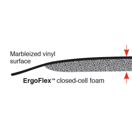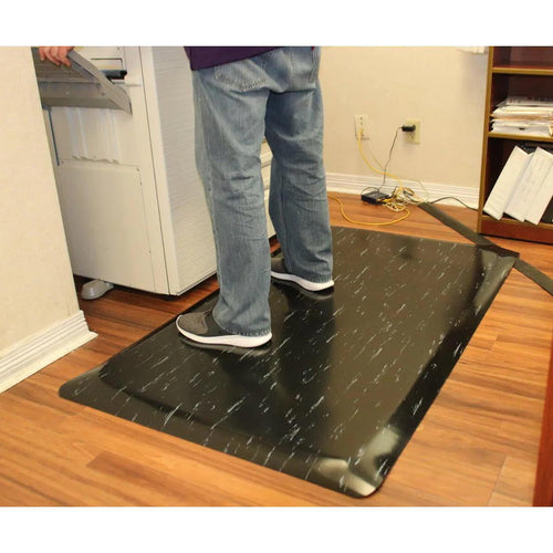 This Apache Mills K-Marble Foot anti-fatigue floor mat is 1/2" thick with a wear-resistant vinyl surface bonded to comfortable foam backing that relieves fatigue from prolonged standing. This is the perfect mat for warehouse workers who are on the feet manning ship stations, as well as office workers who work at a standing desk. This extremely durable mat resists common chemicals and solvents when cleaned regularly. Great for both office and heavy duty use!