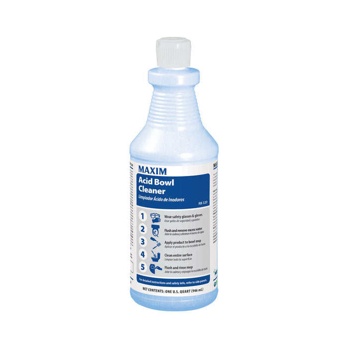 This Midlab Maxim Acid bowl cleaner does a great job of cleaning and deodorizing porcelain bowls in toilets and urinals. Its high acid emulsion formulation removes calcium, lime, scale, iron/rust stains and uric acid build-up from toilet bowls and urinals. Inhibited hydrochloric acid effectively removes the toughest stains and build-ups quickly and completely. Cleans, and deodorizes in one step. Contains 20% hydrochloric acid detergents and inhibitors. Excellent for use in hard water and well water areas, as well as for heavy build-ups.