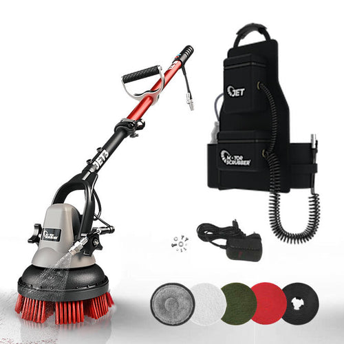 The MotorScrubber® JET3’s targeted, on-demand solution application allows you to deep clean spaces neglected by other handheld scrubber machines. Powered by an M10 Motor with a 3.5-hour runtime, this scrubber delivers high torque in a lightweight package, weighing around 3.8 pounds. With a telescopic handle, it’s easy for all heights to handle. Once you’ve set the 28" to 55" telescopic handle to the right length, JET3's pivoting handle can easily access and clean under objects as low as 8 inches.