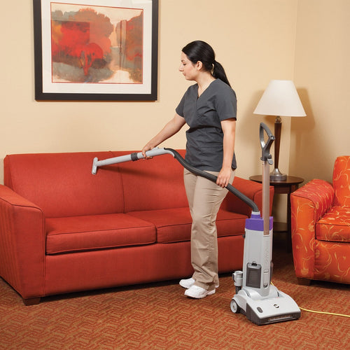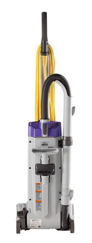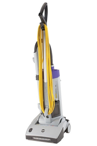 This ProTeam ProGen 12 is a single motor upright vacuum that is ergonomic, lightweight, and easy to maneuver. It features an animated dashboard display that alerts the user to a jammed brush roll, an airflow blockage, and when the bag is full. The snap lock lid guarantees a reliable seal for maximum efficiency and easy change out of the replacement bag.