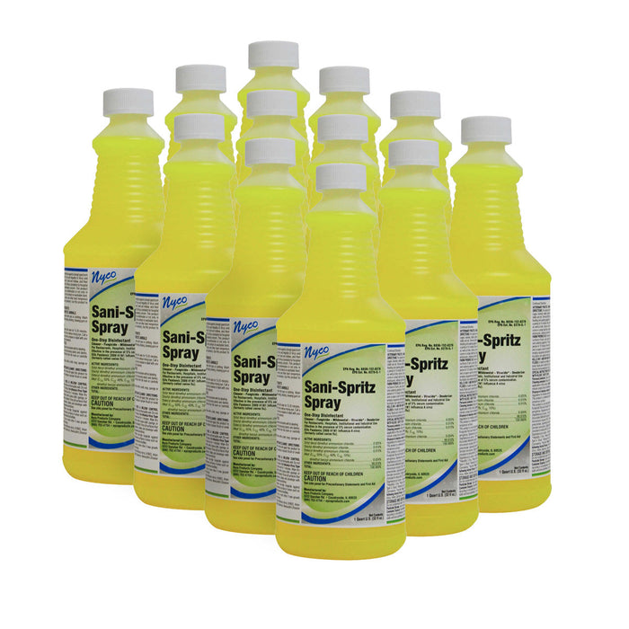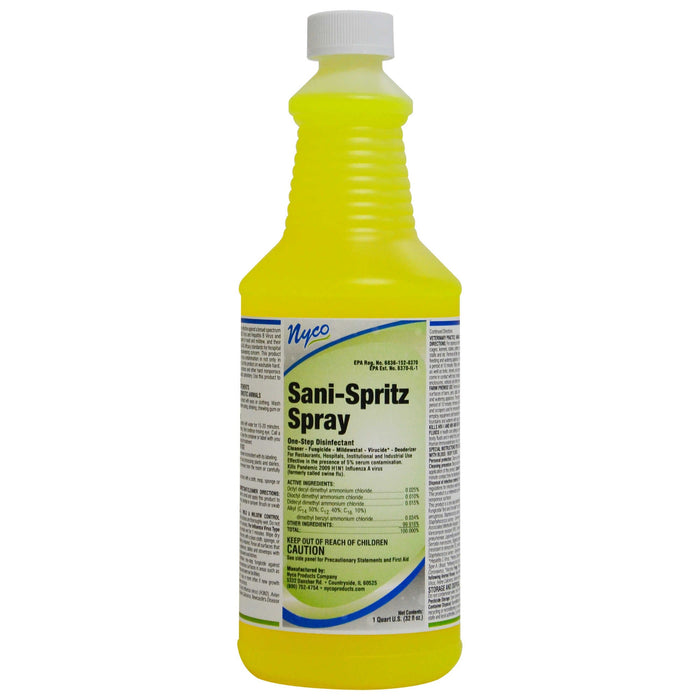 Nyco Sani-Spritz is a one-step disinfectant and cleaner that is a powerhouse on so many levels. It is specially formulated to be a key part of reducing cross-contamination in hospitals, schools, restaurants, institutions, and industries. Requires a 3 minute dwell time to be effective against a broad spectrum of bacteria, viruses (including HIV-1, the AIDS Virus, SARS, Hepatitis B Virus and Hepatitis C Virus), and fungi. Quickly inhibits the growth of mold and mildew, along with their odors, when used as directed. It has been proven effective to kill the Pandemic 2009 H1N1 Influenza A Virus, as well as the SARS-CoV-2 (COVID-19).