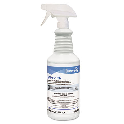 Diversey Virex Tb is a ready-to-use quaternary-based, hospital-grade disinfectant provides excellent cleaning and deodorizing action in one easy step. Powerful bactericide, tuberculocide, virucide and fungicide disinfects surfaces within three minutes of contact. Meets bloodborne pathogen standards for decontaminating blood and bodily fluids.
