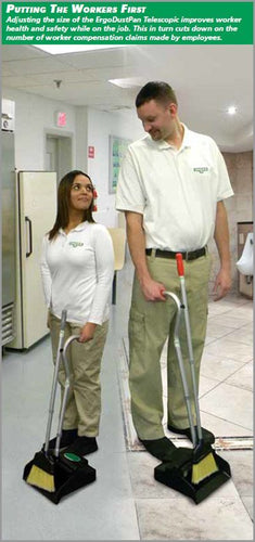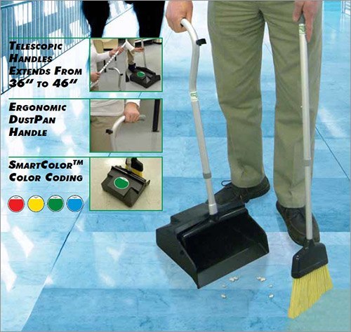 When you have several employees that are of different heights it's handy to have an adjustable dustpan for everybody's use. This telescoping dust pan is adjustable for anybody to use, for someone at 5 feet all the way to almost 7 feet tall. No more stooping over to hang onto the dust pan while you sweep into it. Each piece can be color coded to keep in different areas of your facility. This way, the broom you use to sweep the bathroom, can't also be used in the kitchen.