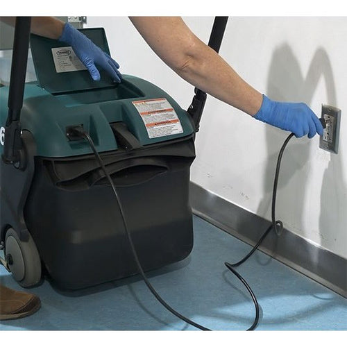 The Tennant® S6 is a battery powered walk-behind vacuum sweeper with a 25" sweeping path. The S6 can clean large areas quickly while picking up debris and controlling dust. It can clean anywhere, at any time, due to it being battery powered. Will run for about 2 hours on a full charge. Great for both hard floor and carpeted areas.