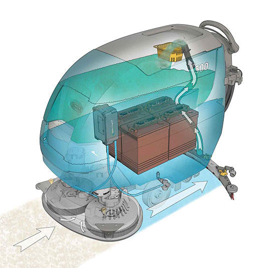 This T500 scrubber has two 13" pad drivers to make up the 26" cleaning path so you can scrub up to 28,600 square feet per hour. The scrubber also comes with 4 6V 225AH batteries and on-board battery charger. The pad holder can hold a varity of floor pads like the poplular 13" red scrubbing pads, 13" black stripping pads, and white floor buffing and polishing pads. We also carry 13" brushes for the T500e, which work well on uneven floors like concrete and tile.