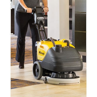 This Tornado 'BD 17/6' Auto Scrubber sports a 17 inch head and a 24V battery which gives this unit the versatility and maneuverability to make it a great machine for small-to-medium sized spaces and hard-to-clean areas like underneath counters where the traditional mop and bucket are usually used. The BD 17/6 is designed with an integrated parabolic squeegee system that hugs the pad within one inch. This allows for immediate pickup of solution that is laid down from the 6 gallon solution tank and recovered into a tank of the same size. This same squeegee assembly is made to rotate left and right 180 degrees, allowing for top notch solution recovery (even in reverse) during the recovery process. This whole system is made to provide you with the ability to tackle the most difficult cleaning jobs quickly and efficiently.